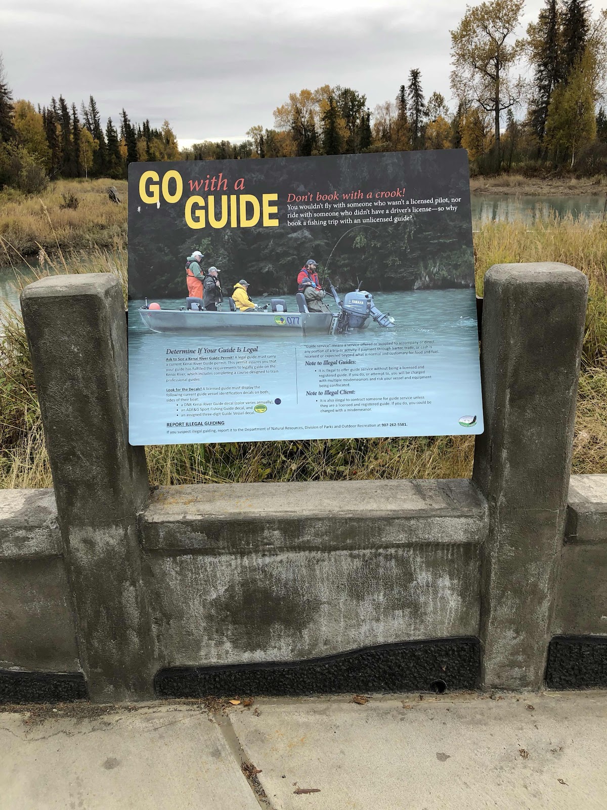 Almost always, when we’re fishing on the river and a restroom break is needed, we go back to the cabins. After all, the cabins are convenient and I know Jane keeps them clean. However, on a rare occasion this past September, we decided to stop at the Eagle Rock boat launch to take a break. Upgrades have been made to this site and one of the many new things I saw was a prominent sign sponsored by the Kenai River Professional Guide Association. It was hard not to notice the headline: Go With A Guide, Don’t Book With A Crook. That’s about as blunt as a baseball bat fish whacker...