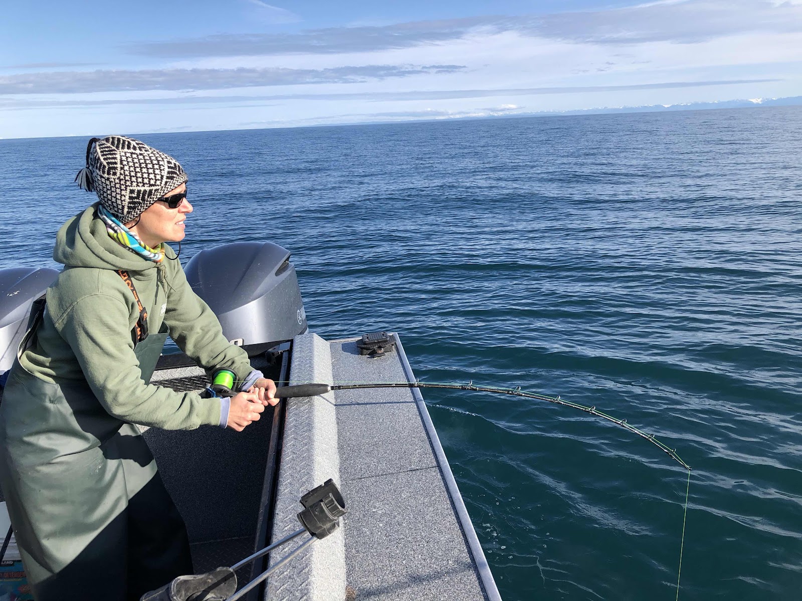 We first tried to catch a few king salmon. No luck. We switched over to halibut and had consistent action. Here’s Jane with her first fish of the day.